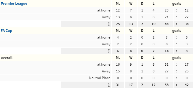 – 31 trận đối đầu: Arsenal thắng 17, hòa 2, thua 12, ghi 58 bàn, thủng lưới 42 bàn