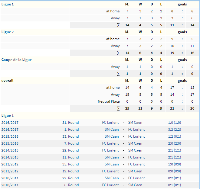 – 14 lần tiếp đón Lorient: Caen thắng 6 trận, hòa 4 trận và thua 4 trận. Ghi được 17 bàn thắng và để lọt lưới 13 bàn.