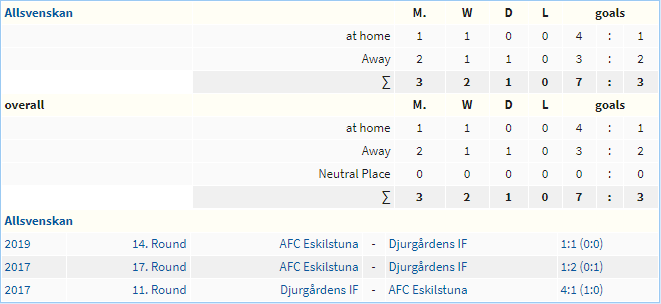 – 3 trận đối đầu: Djurgardens thắng 2 trận, hòa 1 trận và chưa thua trận nào. Ghi được 7 bàn, lọt lưới 3 bàn.