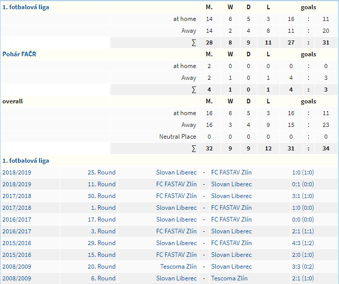 – 32 lần đối đầu: Fastav Zlin thắng 9 trận, hòa 9 trận và thua 12 trận. Ghi được 31 bàn và lọt lưới 34 bàn.