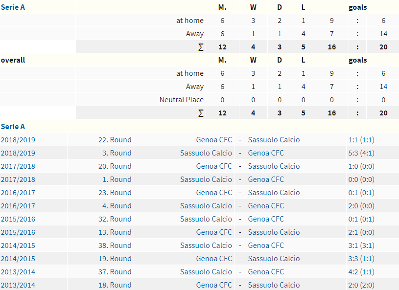 Lịch sử đối đầu Genoa vs Sassuolo