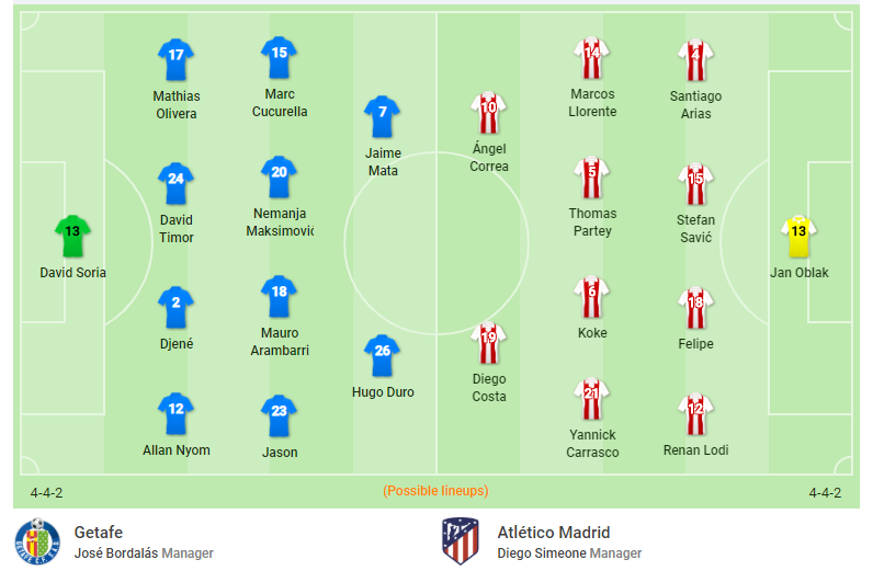 Đội hình dự kiến giữa hai đội Getafe vs Atletico Madrid