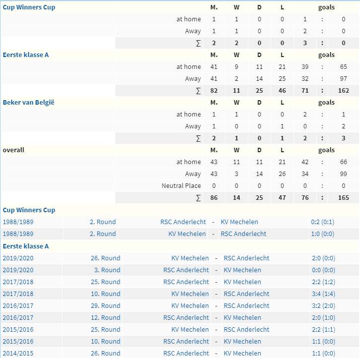– 43 trận tiếp đón Anderlecht: KV Mechelen thắng 11 trận, hòa 11 trận và thua 21 trận. Ghi được 42 bàn, lọt lưới 66 bàn