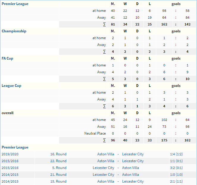 – 45 lần tiếp đón Aston Villa: Leicester thắng 24 trận, hòa 12 trận và thua 9 trận. Ghi được 102 bàn và lọt lưới 64 bàn.