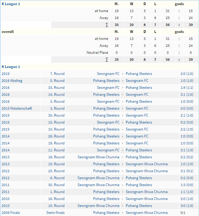 19 trận tiếp Seongnam: Pohang Steelers thắng 13, hòa 5, thua 1, ghi 31 bàn, thủng lưới 15 bàn.