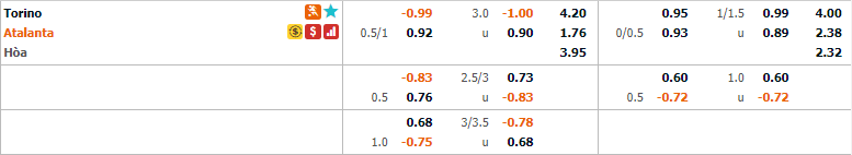 Torino áp đảo về đối đầu trong lịch sử và xét ở 10 trận gần nhất, họ vẫn thắng đến 4, hòa 3, thua 3 trước Atalanta. Thậm chí, trước khi phải nhận thất bại 0-7 trên sân nhà, họ còn thắng 3-2 ngay trên sân Atalanta ở trước lượt đi. Trên sân nhà, Torino thắng 5, hòa 3, thua 2/10 trận tiếp Atalanta gần nhất, đạt tỷ lệ thắng kèo 50%. Trận đấu năm ngoái là lần Atalanta chấp lên đến 0.5-1 trái khi làm khách đối thủ, và một thế kèo tương tự đã xuất hiện ngay lúc này. Tuy nhiên, sẽ không đơn giản để một kết quả có lợi cho đội khách tái diễn, nhất là khi chủ nhà sẽ làm mọi cách để tránh một kết quả không tốt. Và hơn hết, phong độ của Atalanta cũng đang không tốt, và đội bóng này luôn cần một quãng thời gian chạy đà lúc đầu mùa bóng.