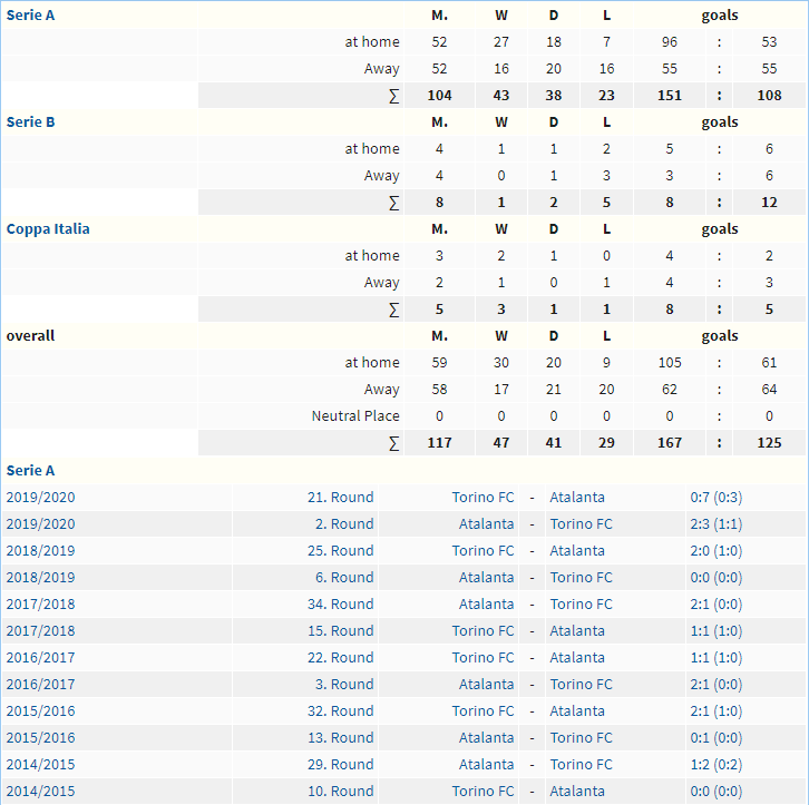 59 trận tiếp Atalanta: Torino thắng 30, hòa 20, thua 9, ghi 105 bàn, thủng lưới 61 bàn.