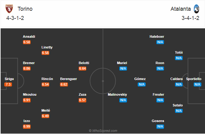 Đội hình dự kiến giữa 2 đội Torino vs Atalanta