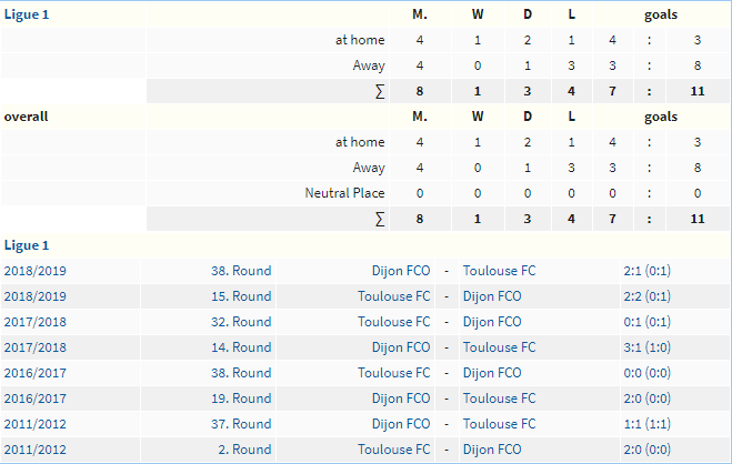 – 4 trận tiếp đón Dijon: Toulouse thắng 1 trận, hòa 2 trận và thua 1 trận. Ghi được 4 bàn, lọt lưới 3 bàn.