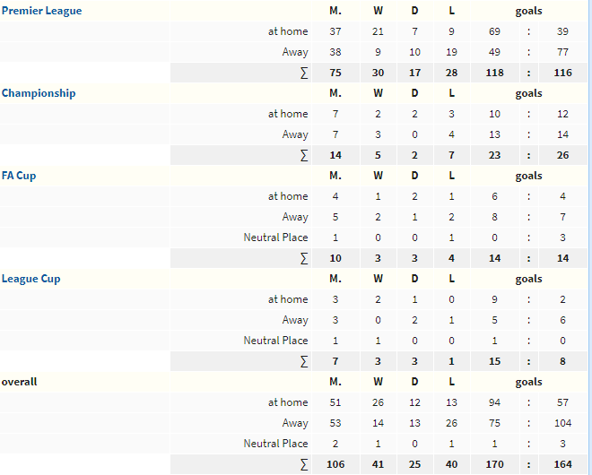 – 106 trận đối đầu: West Brom thắng 41, hòa 25, thua 40, ghi 170 bàn, thủng lưới 164 bàn
